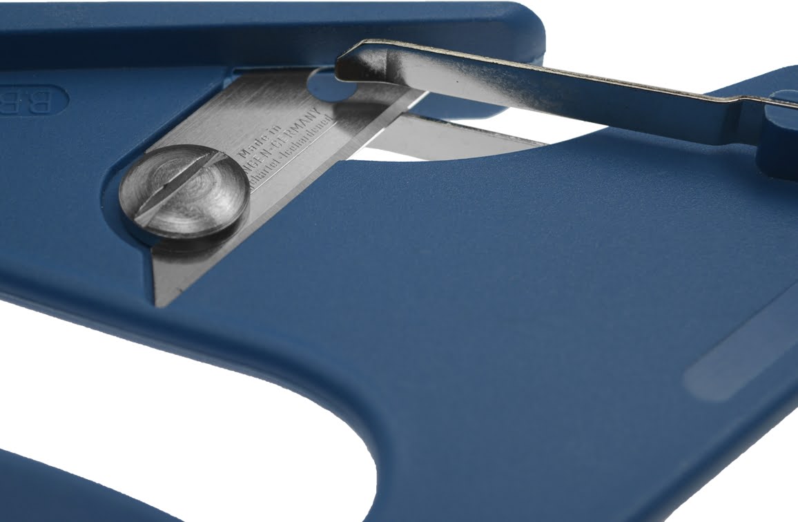 Ieder mesje van het blauwe schuifmes is aan 2 zijden bruikbaar en zit stevig verankerd de meshouder.