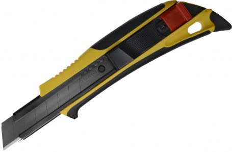 Lock-knop & Schuif-knop: de rode knop is om het mes te vergrendelen, met de zwarte duimknop is het mes maximaal twee segmenten uit te schuiven.