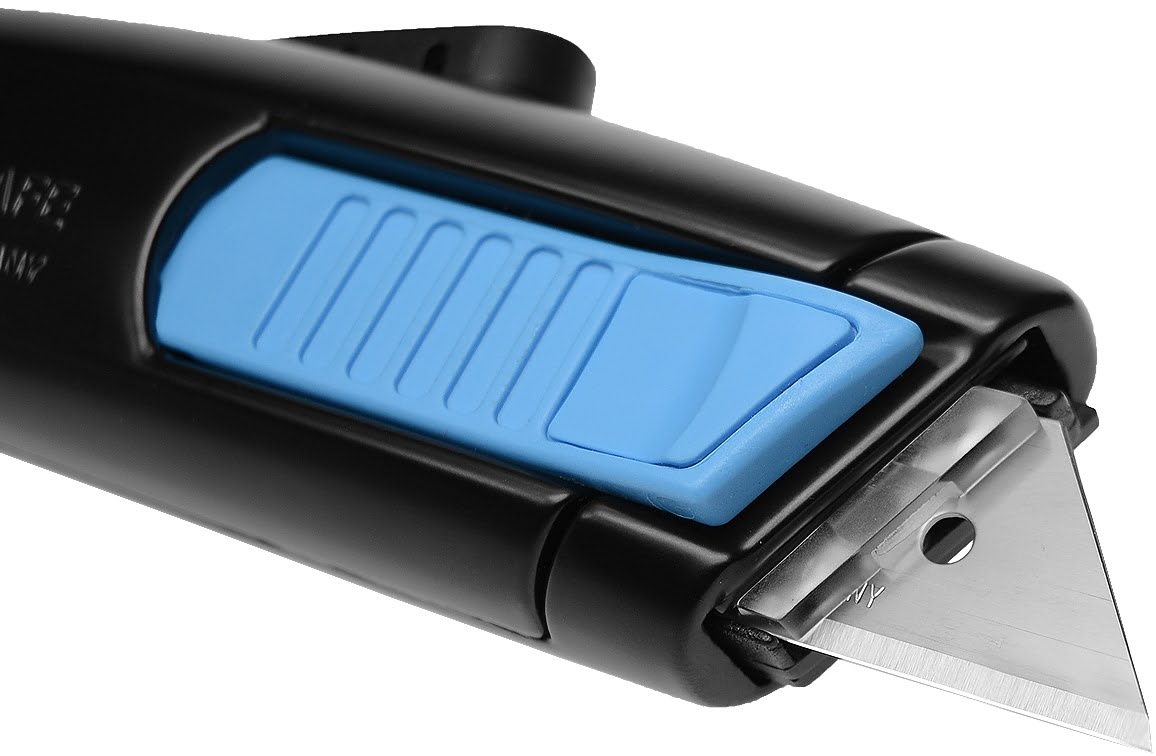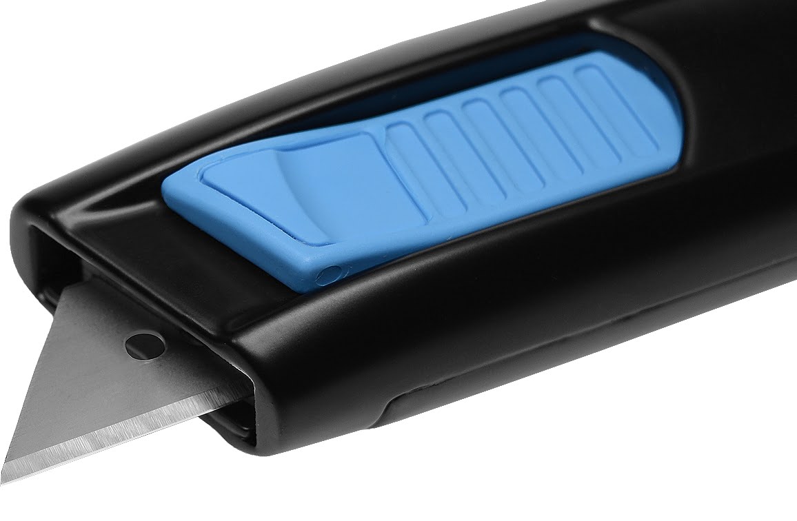 Het mesje is makkelijk en veilig te vervangen. De duwknop bovenaan dient ingedrukt te worden en de schuifknop dient naar voren geschoven te worden. Het mesje is dan klaar om vervangen te worden.